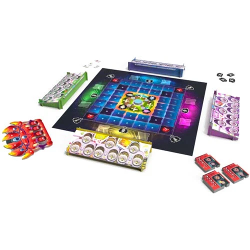 Each turn, all players press, in the order they want, 2 of the 9 buttons on their cockpit dashboard and instantly apply their effect. These buttons allow you to move around in space, shoot a ship or activate the copy action. Each time you move onto a new Space tile, you flip it. If you find out a jammer, you must use 1 energy to destroy it. All players start with 1 energy and can gain 1 energy from each enemy ship killed. Be careful not to shoot a friend, you would make him lose 1 energy. When all players have pressed their two buttons, they flip them again. Please note: it’s great not to forget them for the next turns. Then reveal the end of turn floppy and apply its effect. Alien Spaceships are coming from all sides!